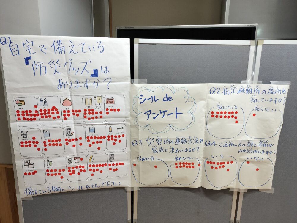 当日は、11組28名 親子の皆さんにご参加いただきました。受付を済ませた後は、防災に関する「シールアンケート」に答えてからスタートしました。まず初めに、まちづくり委員会から、「醒泉学区の防災まちづくり」についてのお話を聞いていただきました。