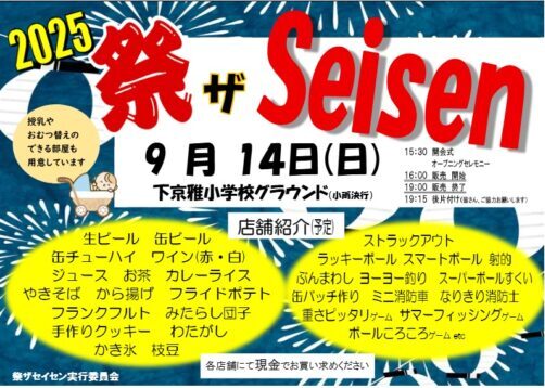 令和7年9月14日(日)に下京雅小学校のグラウンドをお借りして、「2025祭・ザ・Seisen」を皆様のご協力を得て開催することができました。